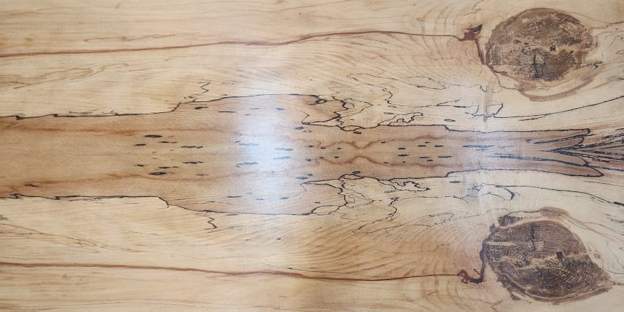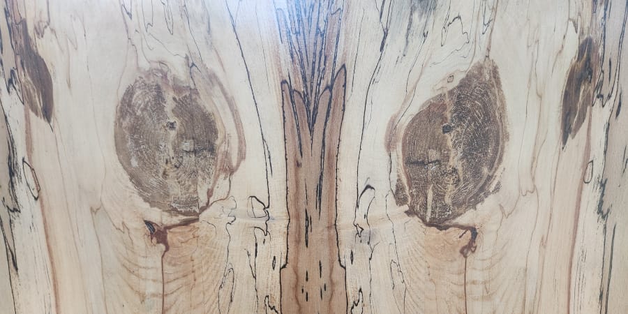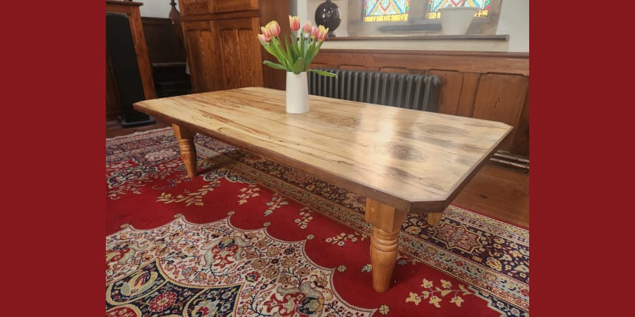 Something a little bit different. A heavily figured, book-matched, spalted beech coffee table with beech edge bindings on hand turned spalted beech legs. Two large knots have been highlighted and along with the figuring in the spalting, this gives us the Owl’s face. Well, we think it does. The table has been sealed and finished with beeswax from local bees (courtesy of Phil G.)