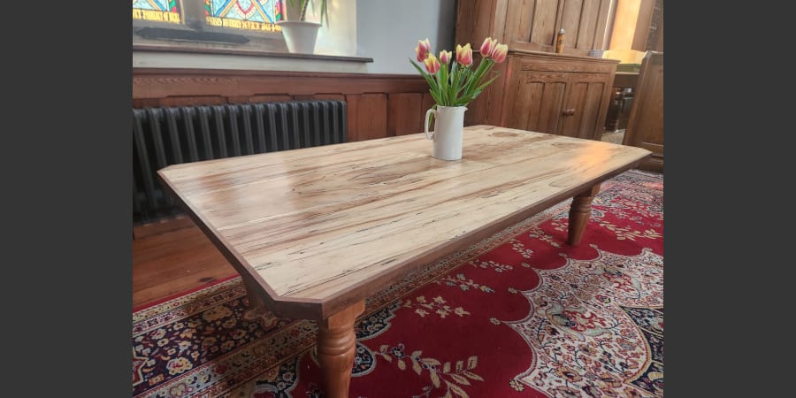 Storm Desmond (2015) one of the first ‘named storms’ did a lot of damage. But, as the proverb has it, the clouds did indeed have silver linings. A number of local Beech trees, weakened by age, were brought down. Given the large number of downed trees it took a while for Hughie to get to them and tidy them up. As luck would have it this was the perfect amount of time for the spalting to do its work. When the wood was finally sawn, it was found to be beautifully figured throughout its length. Some of the more gently figured wood was sawn as 4” x 4” lengths to make legs - which were turned by Michael B. The top was split and book-matched to create the symmetrical pattern you can see. Edged in more beech (darkened with traditional wood stain made from roasted walnut shells) the table is definitely one of a kind.